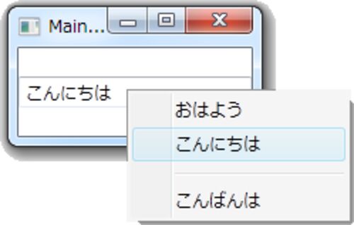 A. ContextMenu を使用します。 以下、Livet を使った簡単なサンプルです。TextBox に ContextMenu を設け、右クリックでポップアップを表示、選択したメニューを TextBox に表示します。